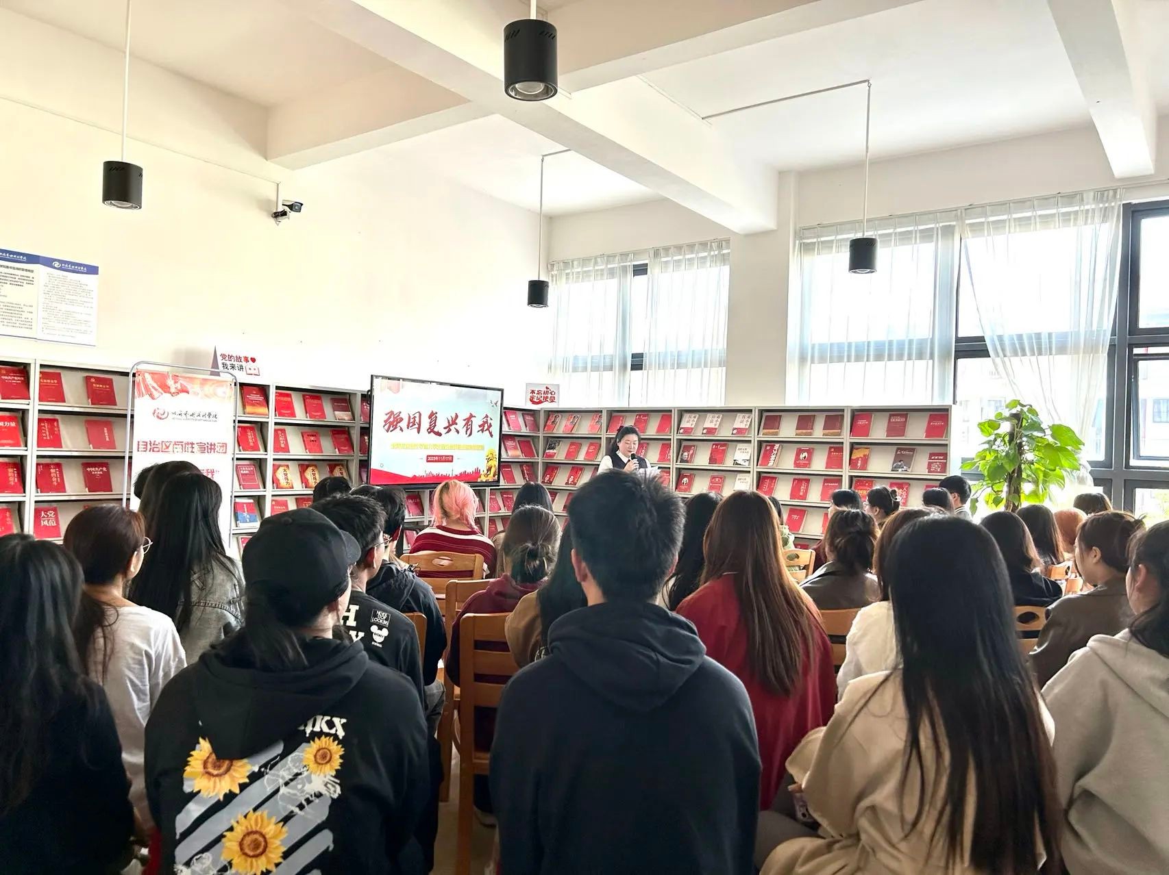 为了深入宣传贯彻习近平新时代中国特色社会主义思想,11月17日,由学校党委宣传部统筹,大学生理论宣讲团开展的习近平新时代中国特色社会主义思想进校园暨“强国复兴有我”主题宣讲活动在我校图书馆举行。各党总支学生代表共计60人参加宣讲活动。