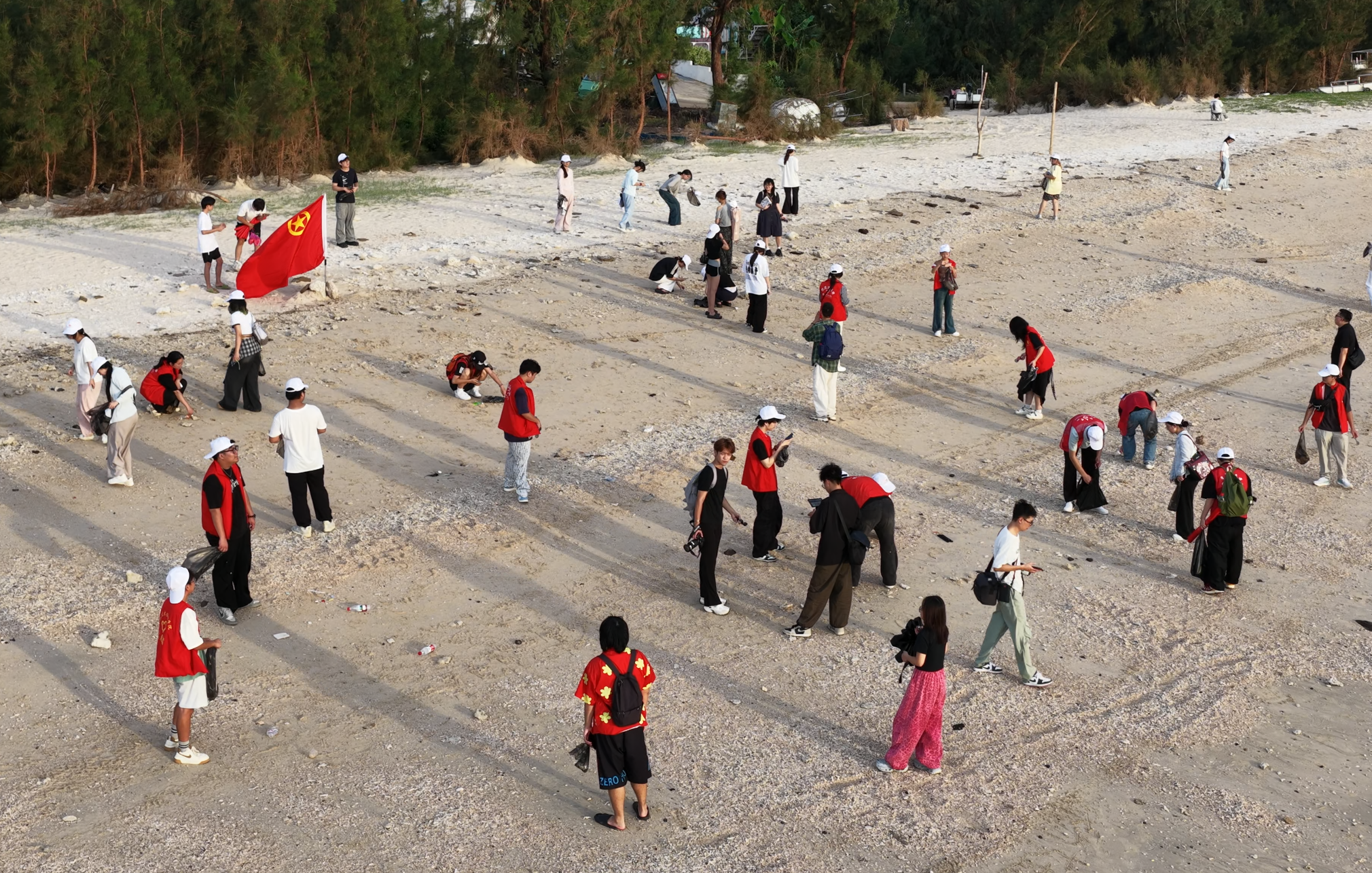 活动伊始,志愿者们纷纷穿上红色马甲,按照分团委指导老师安排的区域分为三个小组展开行动。他们沿涠洲岛蜿蜒的海岸线散开,俯身拾起被潮水推上岸的塑料瓶、渔网碎片和零食包装——那些藏匿在碎珊瑚与礁石缝隙间、附着在沙滩贝壳旁的垃圾,都被他们仔细地找出来,一一收集进分类垃圾袋中。此刻夕阳照在每一位志愿者的身影上,映照出影视动画学院分团委团结奋进的集体意识与不负使命的责任担当。