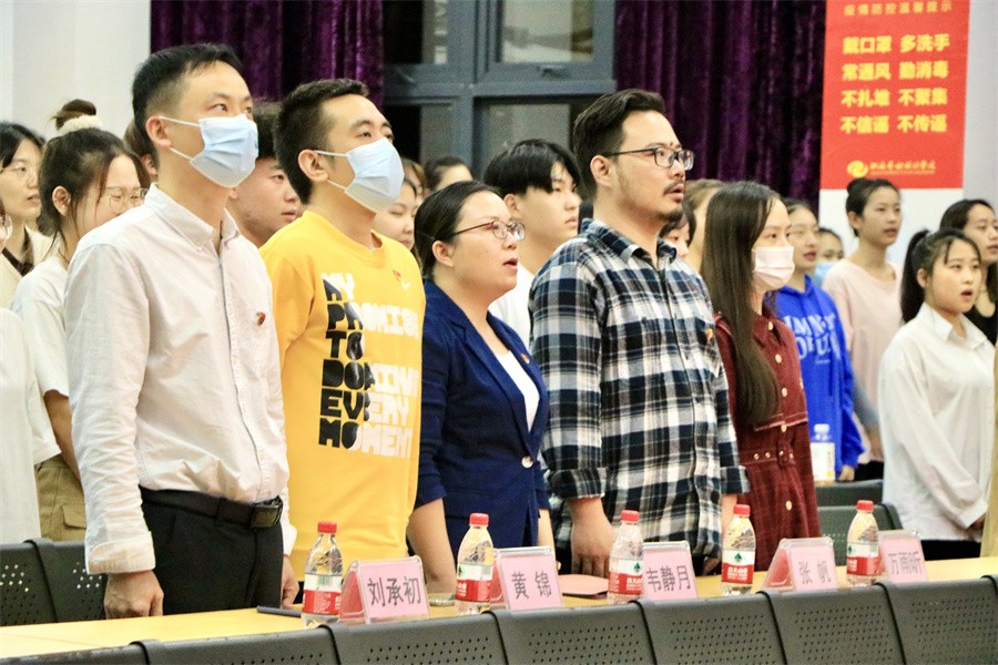 开班典礼在庄严的国歌中正式拉开序幕,与会全体成员起立,奏唱国歌。学员代表播音专业2102班的张洲上台发言,她号召同学们严格要求自己,遵守纪律,主动完善自己,逐步向党组织靠拢。