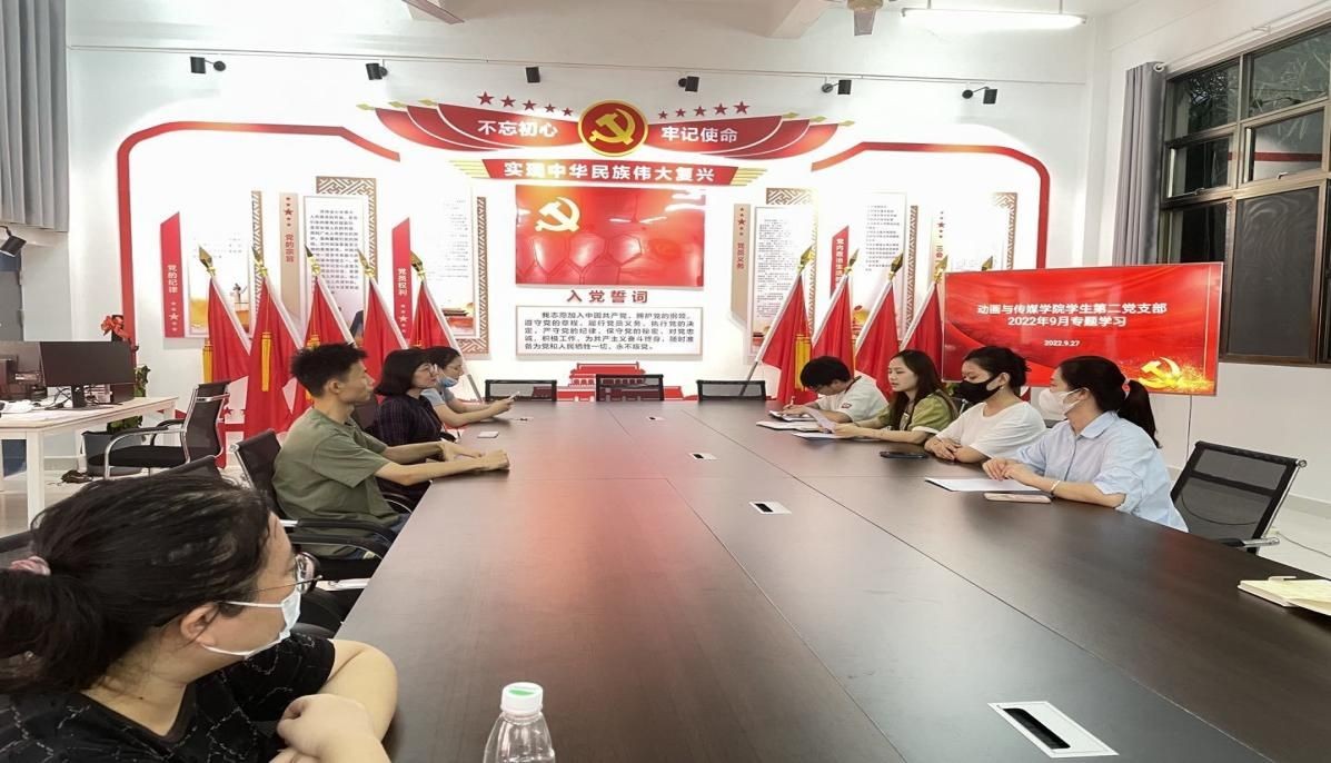 2022年9月27日,动画与传媒学院学生第二党支部在综合楼102召开了专题学习会议,会议由支部书记万雨昕主持,8名支部党员参会。