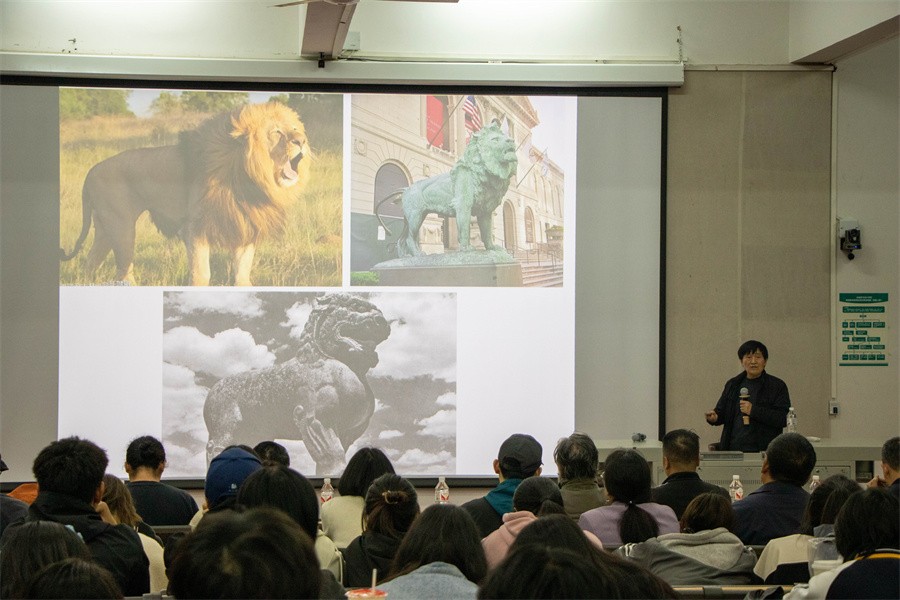 石村教授以几组在同一主题下的中西方雕塑作品进行相对比较,进而阐述中西方雕塑艺术的不同特点。他强调,早期古希腊艺术讲求理想化手法与写实性风格相结合的艺术原则,重视写实技巧,追求作品的形式感,表达个人的独特情感,力图赋予作品以更多的感官之美。而中国雕塑艺术具有突出装饰性和绘画性的特点,注重意象表现,体现了中国古代哲学精神。此外,石村教授通过举例中国古代典型著名的雕塑,说明中国古代雕塑也具有追求写实性的原则,并建议广大师生在鉴赏雕塑作品时应做到全面整体的观察。