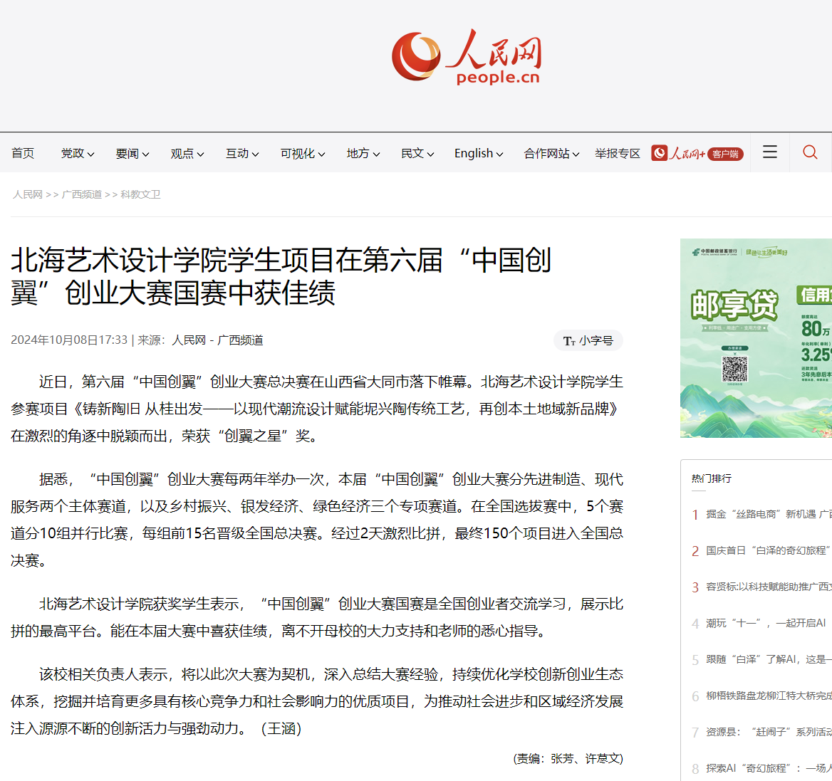 人民网:北海艺术设计学院学生项目在第六届“中国创翼”创业大赛国赛中获佳绩