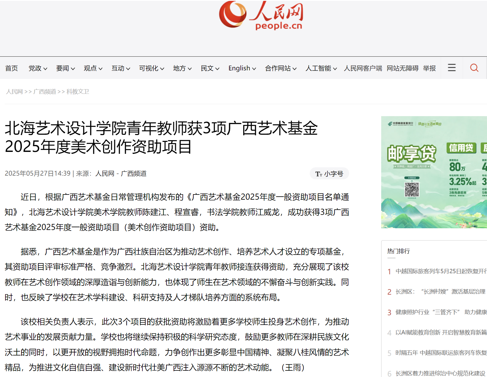 人民网:北海艺术设计学院青年教师获3项广西艺术基金2025年度美术创作资助项目