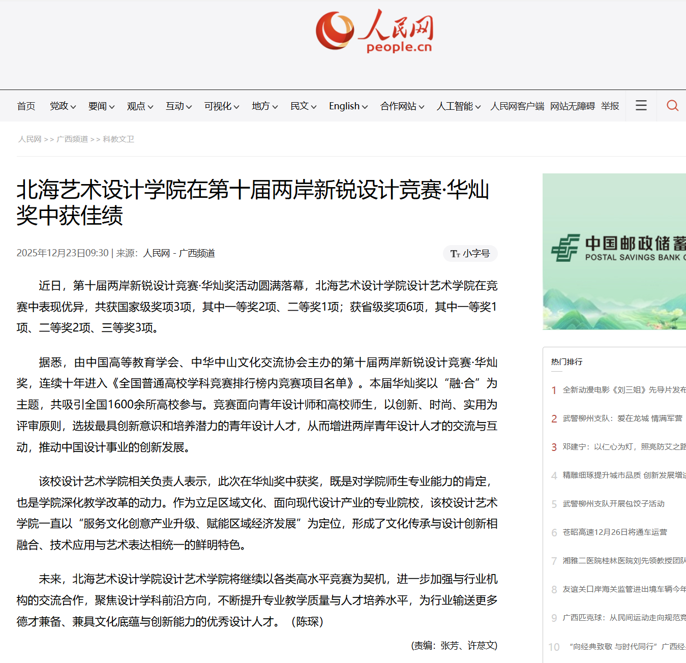 人民网:北海艺术设计学院在第十届两岸新锐设计竞赛·华灿奖中获佳绩