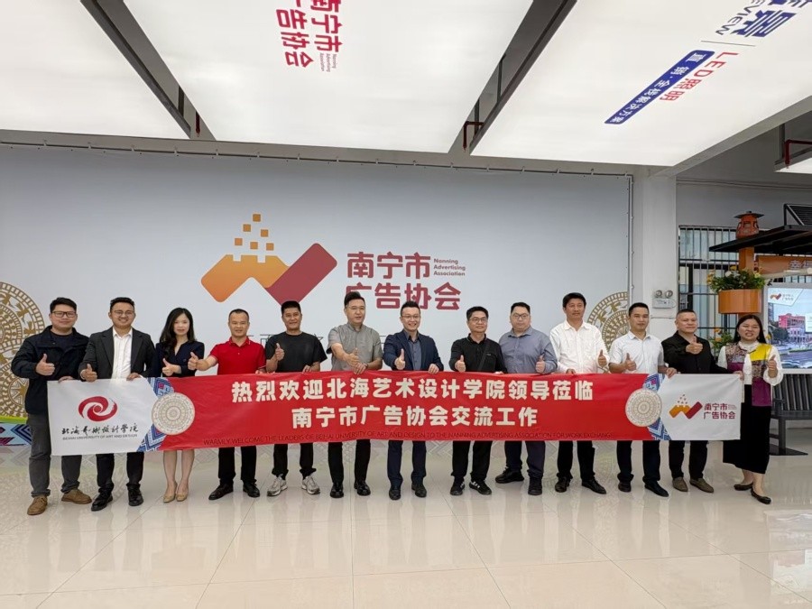 随后,学校一行到访南宁市广告协会,与协会及部分会员单位代表座谈。协会副会长刘兆钟详细介绍了南宁广告行业发展趋势、人才需求结构及行业标准建设情况。设计艺术学院副院长白建强介绍了学院视觉传达设计、数字媒体艺术等专业的建设与人才培养情况,希望借助协会平台推动课程内容与行业标准接轨。企业代表纷纷表示,当前广告行业正面临AI技术渗透、复合型人才短缺的发展现状,亟需兼具专业素养、实践能力与创新思维的高素质人才,希望深化与学校的校企合作,实现人才培养与岗位需求无缝衔接。双方围绕协同育人、共建实习基地、定向培养等议题深入交流,刘兆钟表示,协会将发挥平台优势,搭建学校与会员企业的沟通桥梁,助力艺术设计人才与行业需求精准对接。