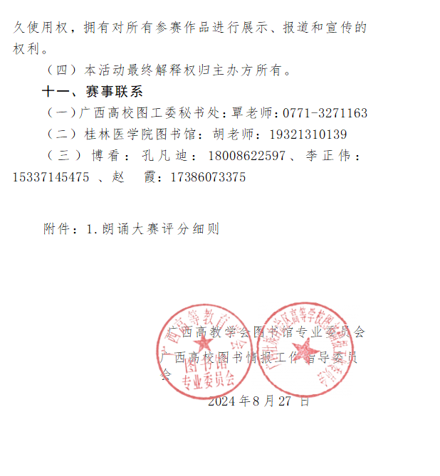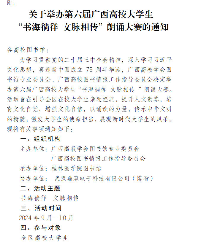 为学习贯彻党的二十届三中全会精神,深入学习习近平文化思想,喜迎新中国成立75周年华诞,广西高教学会图书馆专业委员会、广西高校图书情报工作指导委员会决定举办第六届广西高校大学生“书海徜徉 文脉相传 ”朗诵大赛。活动旨在引导全区在校大学生亲近经典,提升人文素养,培育文化自觉,增强文化自信,以诵读的力量,传承中华文明的精髓,激发大学生的使命担当,展现新时代大学生的风采。现将有关事项通知如下: