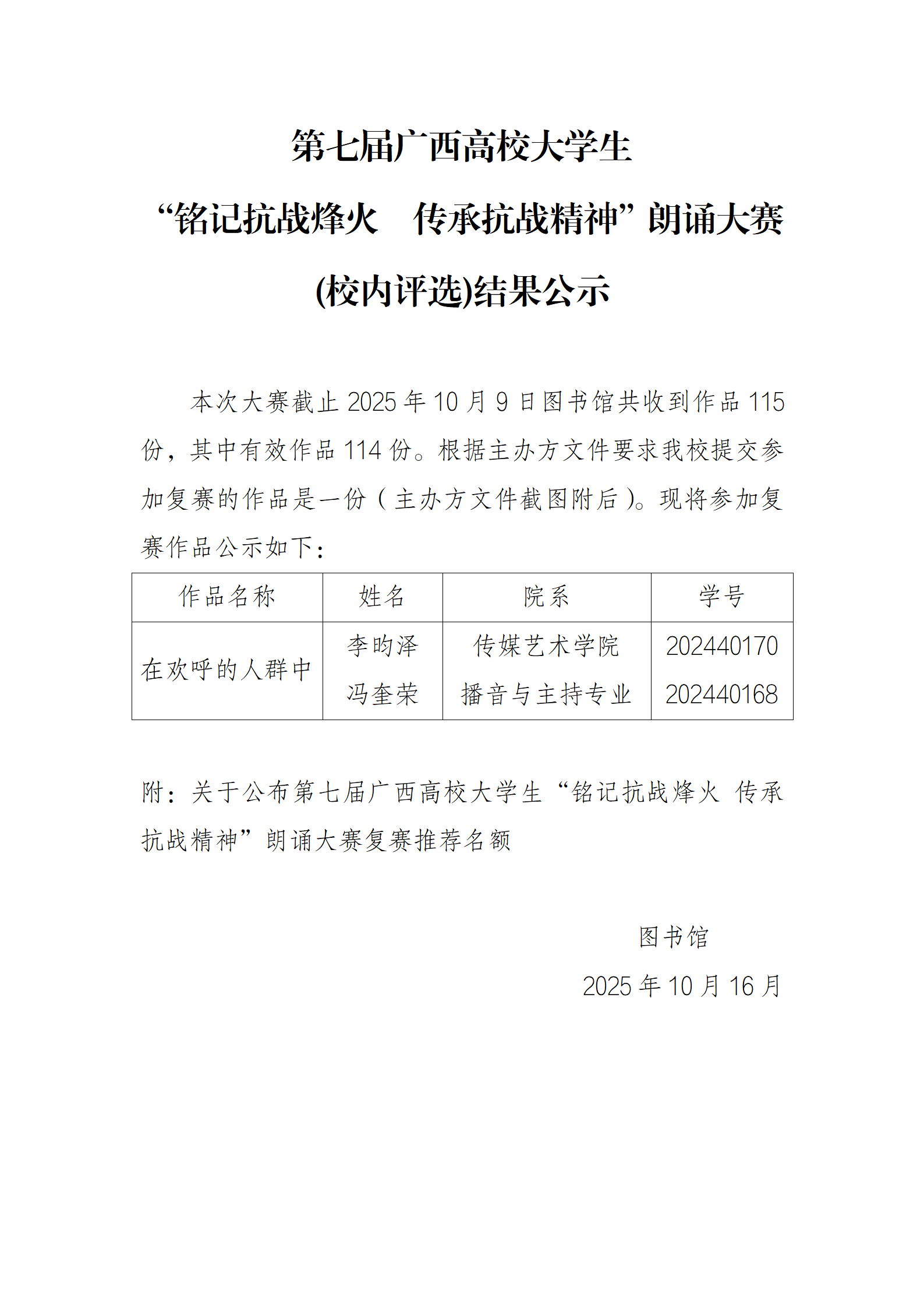 第七届广西高校大学生 “铭记抗战烽火 传承抗战精神”朗诵大赛(校内评选)结果公示