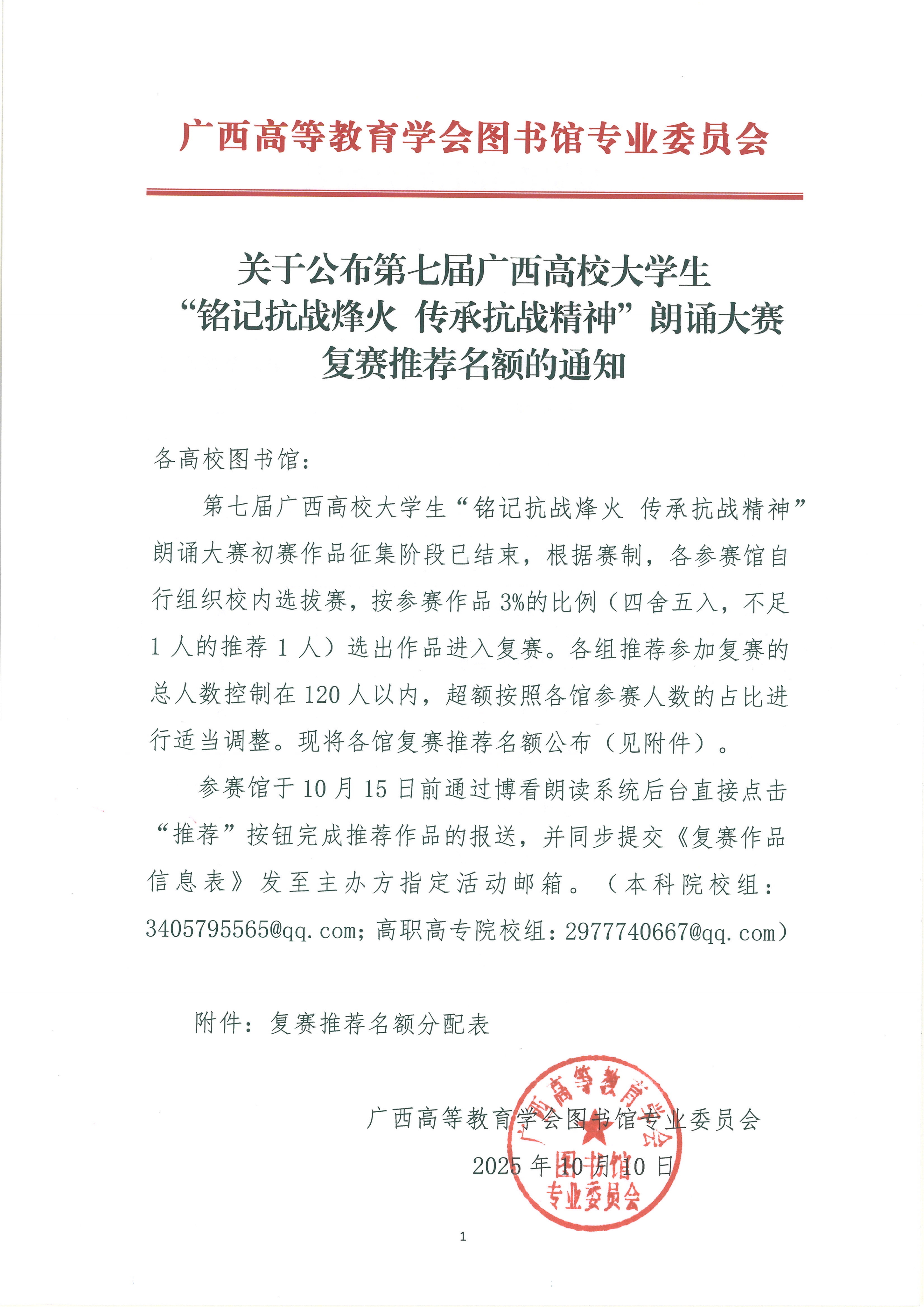 关于公布第七届广西高校大学生“铭记抗战烽火 传承抗战精神”朗诵大赛复赛推荐名额的通知