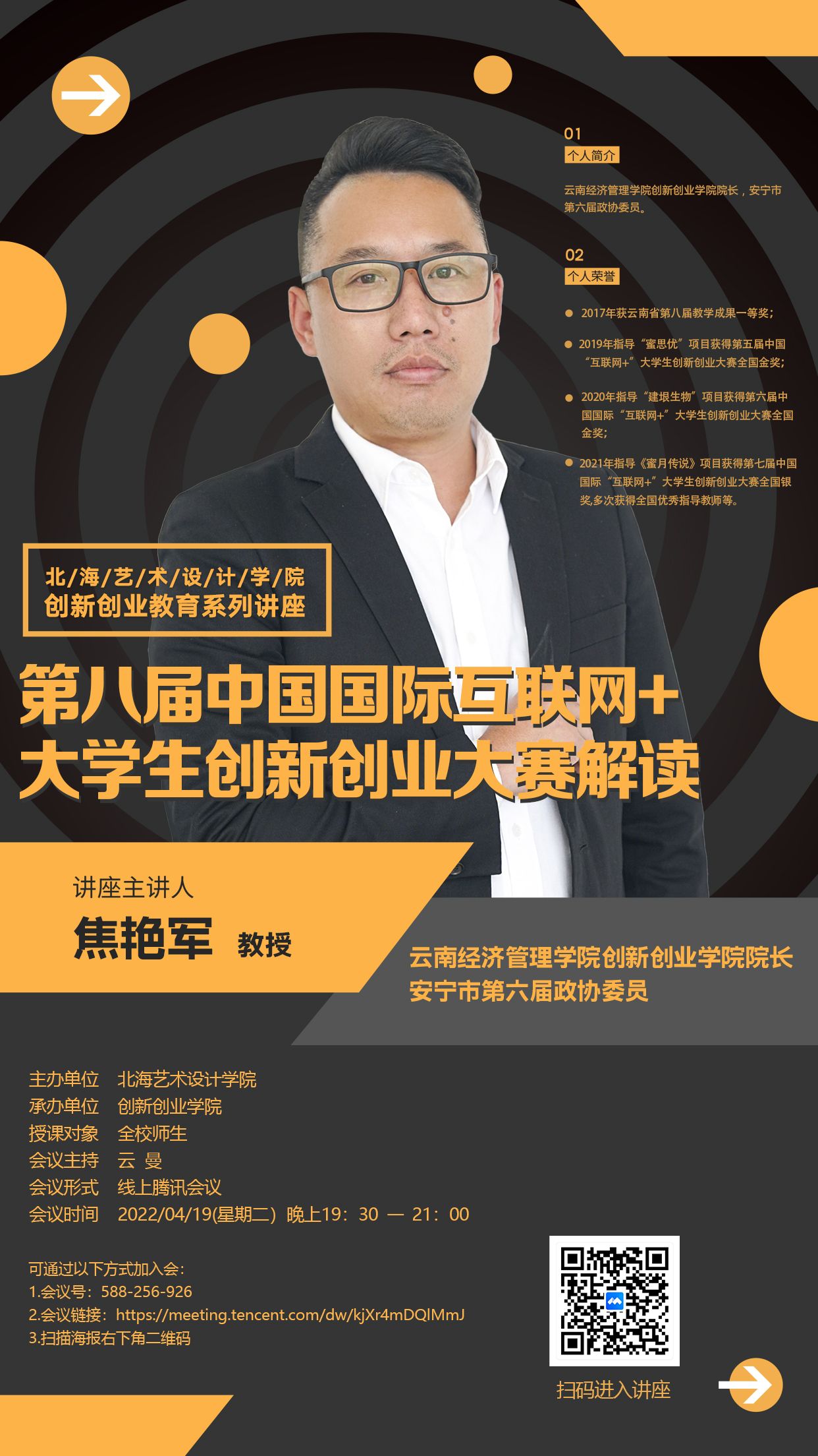 云南经济管理学院创新创业学院院长,安宁市第六届政协委员,2017年获云南省第八届教学成果一等奖,2019年指导“蜜思优”项目获得第五届中国“互联网+”大学生创新创业大赛全国金奖,2020年指导“建垠生物”项目获得第六届中国国际“互联网+”大学生创新创业大赛全国金奖,2021年指导《蜜月传说》项目获得第七届中国国际“互联网+”大学生创新创业大赛全国银奖,多次获得全国优秀指导教师等。