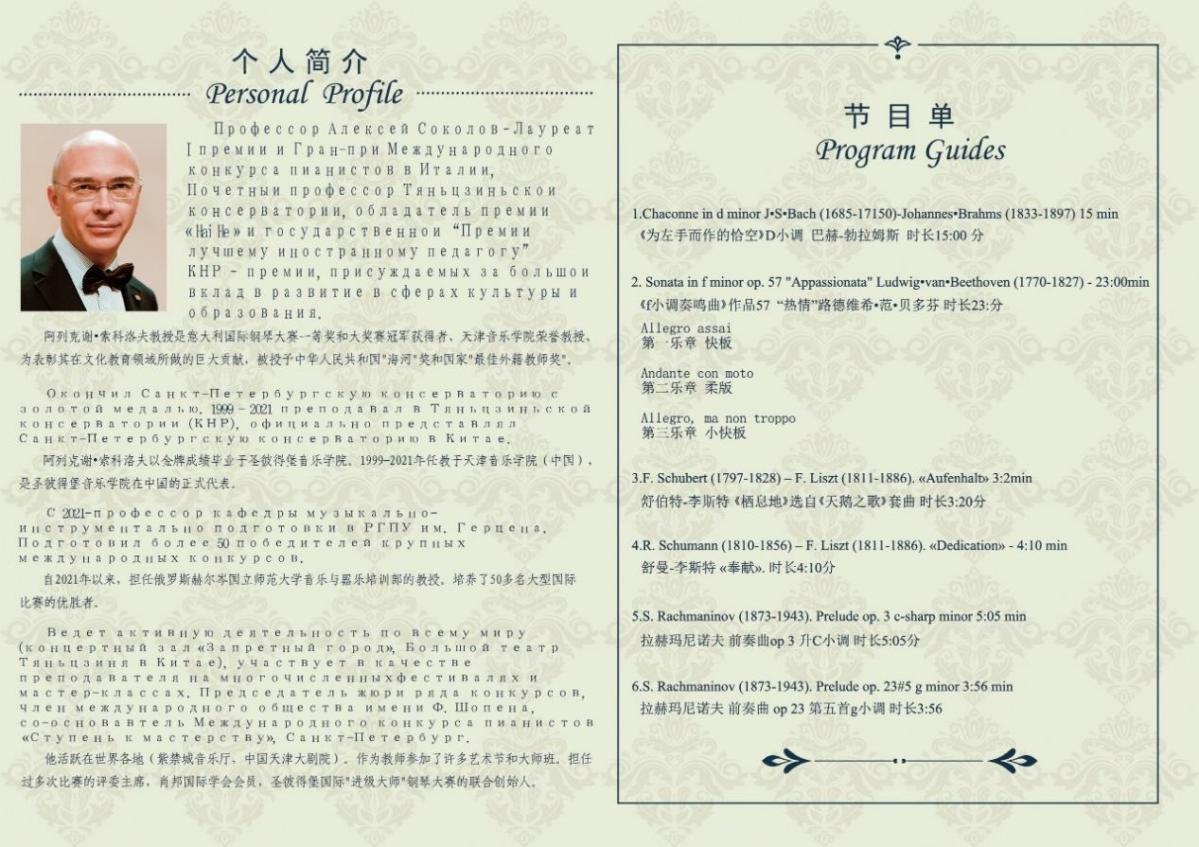阿列克谢•索科洛夫教授是意大利国际钢琴大赛一等奖和大奖赛冠军获得者、天津音乐学院荣誉教授,荣获中华人民共和国"海河"奖和国家"最佳外籍教师奖"。他活跃在紫禁城音乐厅、中国天津大剧院等世界各地,培养了50多名大型国际比赛的优胜者,联合创办了圣彼得堡国际"进级大师"钢琴大赛。