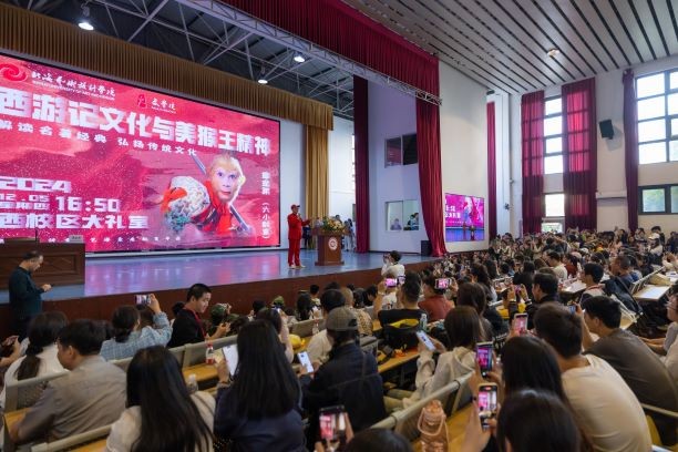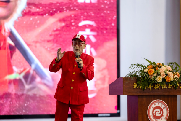 2024年12月5日,一级演员、中国著名表演艺术家六小龄童——章金莱老师受邀来到北海艺术设计学院,为全校师生带来主题为《〈西游记〉文化与美猴王精神》的精彩讲座。本次讲座由文学院主办,常务副院长梁镨文主持。