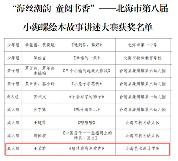 近日,在由中共北海市委宣传部、北海市旅游文体局、北海市教育局、北海市妇女联合会及关心下一代工作委员会联合主办,北海市少年儿童图书馆承办的北海市第八届小海螺绘本故事讲述大赛中,我校教育学院学前教育专业王孟君同学表现突出,荣获成人组优秀奖。