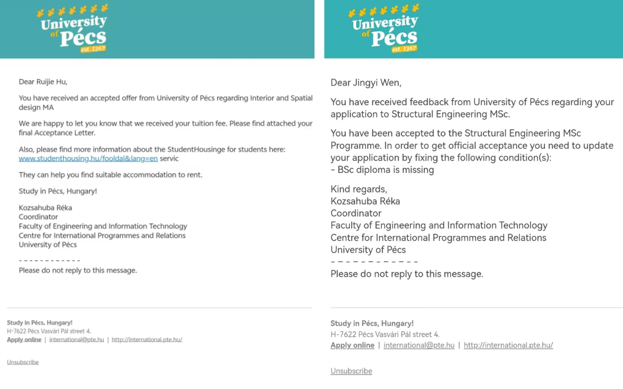 2025年6月,我院环设2108班的胡睿杰同学和土木2101班的文静依同学,相继收到了来自匈牙利佩奇大学的录取邮件。这两名同学均于2024年5月,参加了我院与匈牙利佩奇大学工程与信息技术学院联合举办的短期课程,并顺利取得了课程结业证书。