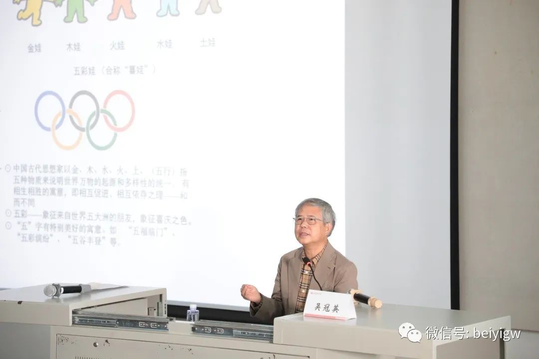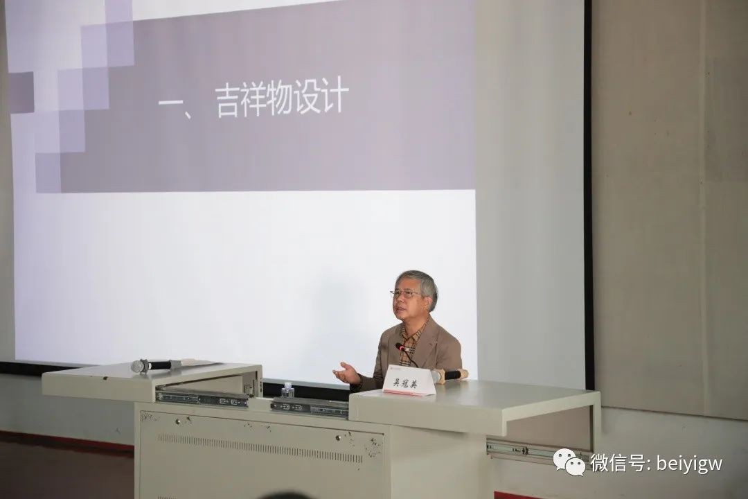 讲座过程中,吴冠英教授从如何理解吉祥物设计、动漫形象设计的外延等方面进行讲解,分享了个人作品2008年北京奥运会“福娃”和残奥会吉祥物“福牛乐乐”的设计过程。他紧密围绕设计思路、研究方法、设计过程和传统文化符号应用延伸进行解析,指出吉祥物设计应准确地表达主题和文化内涵,在设计中要发散思维,产生联想,同时多做取舍,回归至简,并着重强调了“雅俗共赏”的重要性,跳脱固化的艺术思维,探索艺术的形式与风格,为吉祥物赋予文化价值和审美含义,扎根广泛的受众群体,设计出让大众热爱的,美好的形象造型。