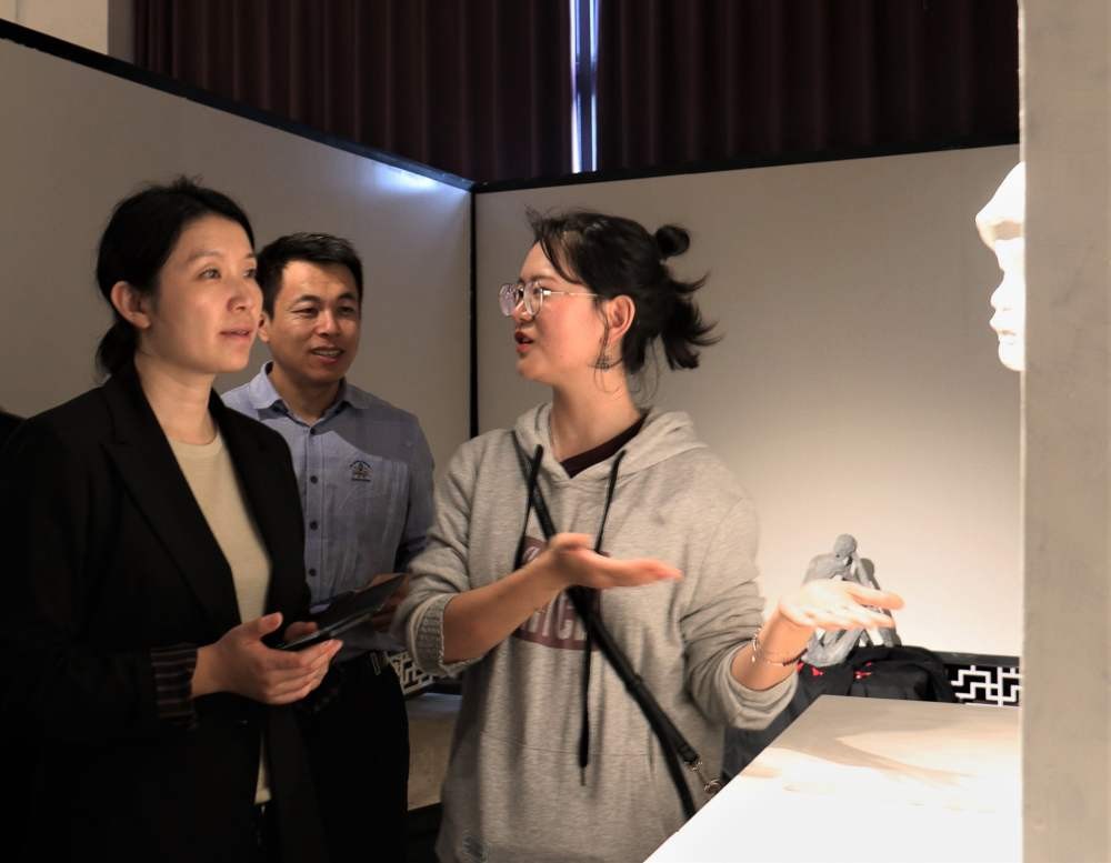 在展览中,学校领导有幸来到了展览现场观看展览,对每件作品都认真审阅,并由雕塑专业老师详细讲解了作品的形式与内涵。对这次展览的成功举办非常赞许,对学生的学习成果也是非常满意。