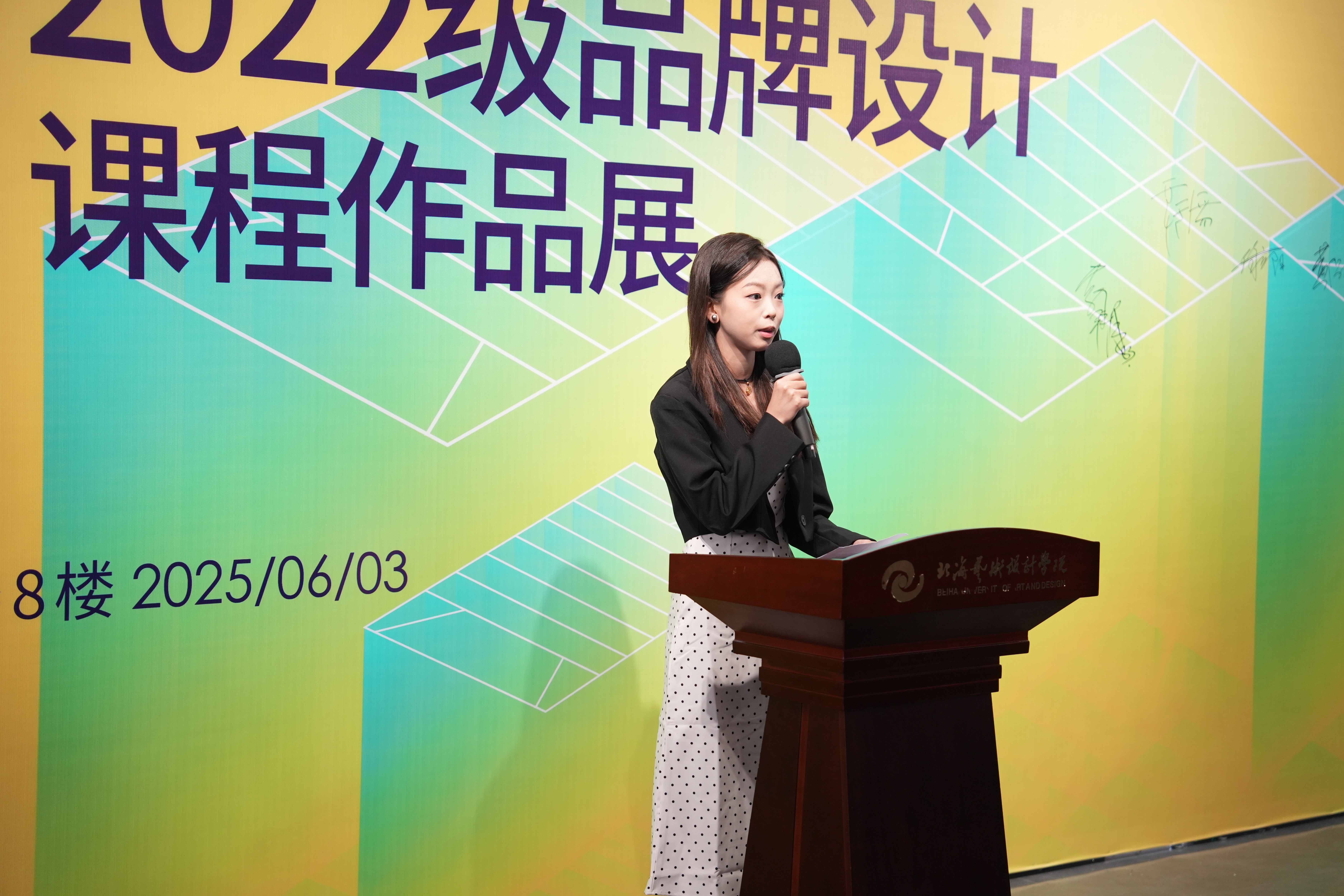 学生代表代荔盈分享了学习心得与感悟。她表示,每一件品牌设计作品都承载着对艺术最纯粹的执着与热爱。在设计过程中,她始终以匠人精神反复推敲,从品牌内核到视觉呈现不断突破创新,力求每个线条、每处色彩都能传递设计之美。代荔盈同学的分享,不仅展现了她对设计艺术的热爱,更传递出新代设计学子追求极致、敢于突破的专业态度。