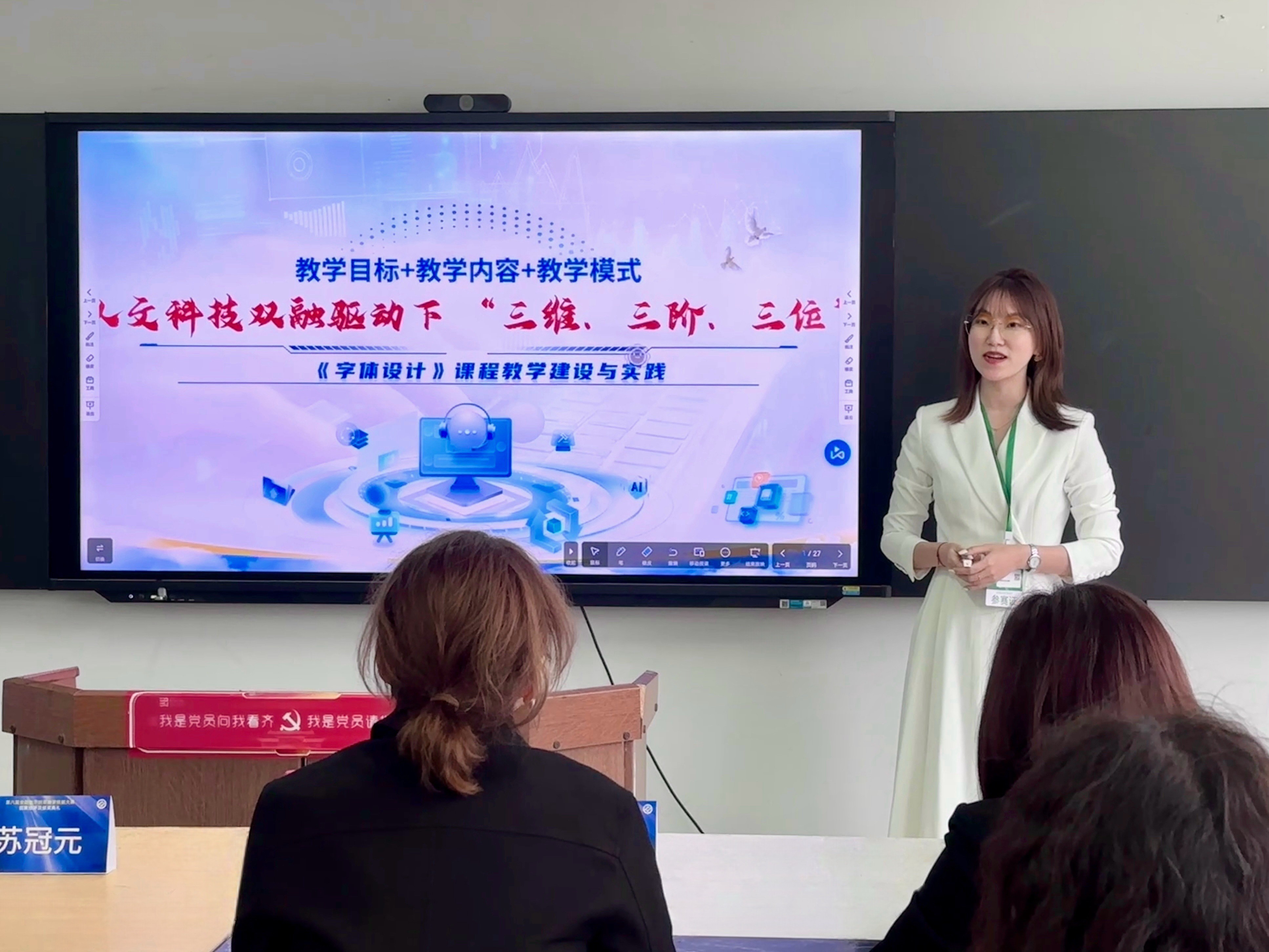 9月27日,李欣颐老师参与国赛现场答辩。她以“在人文科技双融驱动下‘三维、三阶、三位’《字体设计》课程教学建设与实践”为主题,系统展示了课程中融入的AI辅助设计、交互式数字媒体技术等前沿教学手段,并通过学生作品案例生动呈现了教学成果。