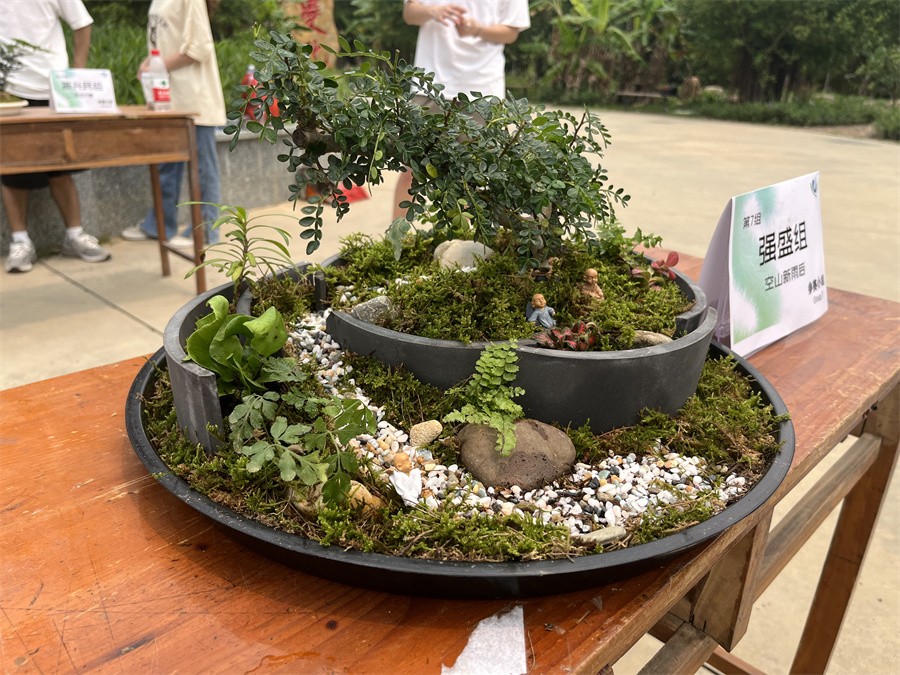 此次决赛的正式比赛时长为40分钟,要求参赛选手在规定的时间内制作出符合植物配置原则、具有美观性的优质微景观模型。决赛现场,各个参赛小组热火朝天、紧锣密鼓地制作小组微景观模型,充分展现专业应变能力和团结协作能力。