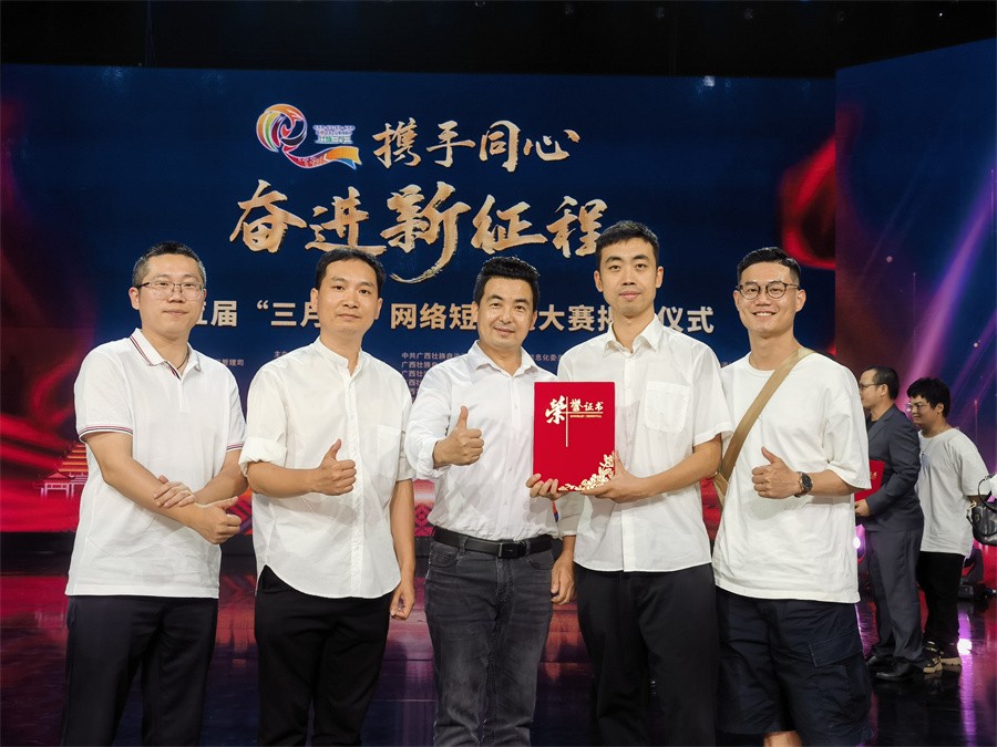 5月28日晚,“携手同心·奋进新征程”第五届“三月三”网络短视频大赛优秀作品揭晓仪式在广西南宁成功举办。本届大赛由国家广播电视总局网络视听节目管理司指导,广西壮族自治区党委宣传部、广西壮族自治区广播电视局牵头,联合内蒙古、西藏、宁夏、新疆等自治区广播电视局,以及广西壮族自治区党委网信办、民宗委、卫健委、商务厅、文旅厅、乡村振兴局、信访局,广西消防救援总队共同主办。我校动画与传媒学院创作团队参加此次颁奖典礼。