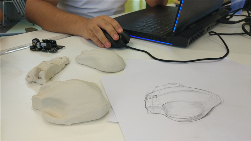 不同专业的同学们根据自己的专长和课题目标通过讨论,确定了每个人在组里的分工,并且很快进入了状态,按照课程安排一步步推进和打磨设计方案,经过无数次的争辩讨论和修改,一个天马行空的构想慢慢的变成了一个实实在在的模型和一个配套的APP方案。油泥模型经过3D扫描和软件建模修正导入3D打印机打印,大家辛苦了半个月的成果终于呈现了出来。